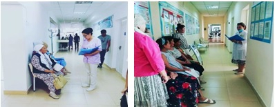 23. Емханада медицина қызметкерлері әр түрлі жастағы тұрғындар арасында «Дұрыс тамақтануды насихаттау (құрамында тұз,қант,трансмайлар көп азық-түліктерді тұтынуды шектеу)», «Қарт адамдарға арналған дене белсенділігі», «Скринингтен уақытында өтіңіз!» тақырыптарына денсаулық сабақтары топтық және жеке әңгімелесу өткізілді.